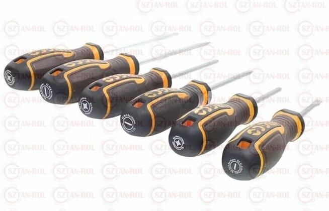 Zestaw śrubokrętów (wkrętaków) 6szt: • 1 szt. SL5,5 x 75mm • 1 szt. PH1 x 75mm • 1 szt. SL5,5 x 100mm • 1 ...
